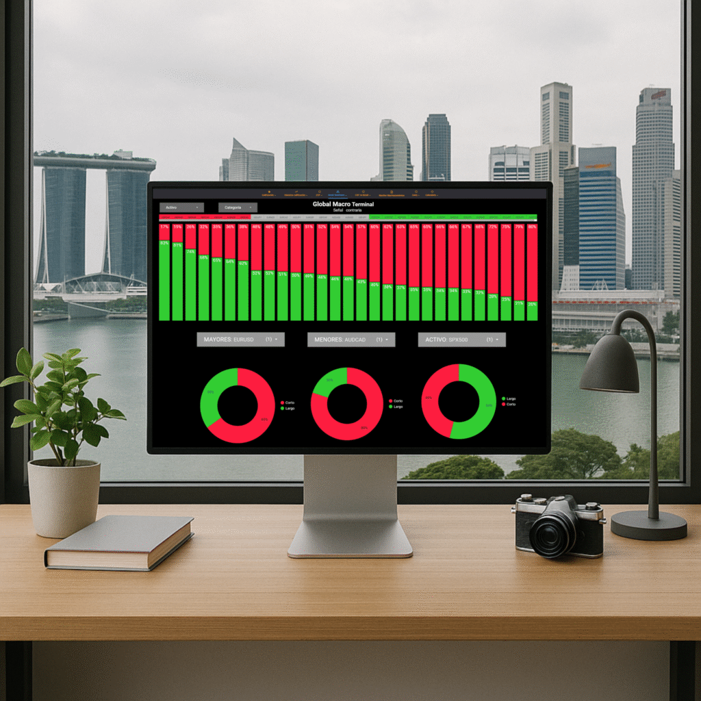 Nuestra terminal te permite visualizar de forma clara y rápida cuándo el posicionamiento minorista alcanza niveles extremos, facilitando la toma de decisiones tácticas y estratégicas con base en el comportamiento del inversor promedio.
